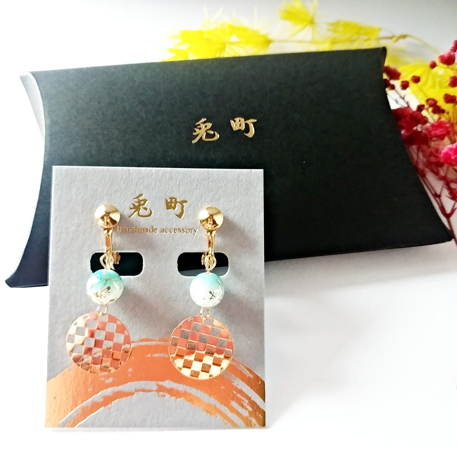和調ビーズと市松模様を組み合わせ、涼しげなデザインの和柄イヤリングです✨