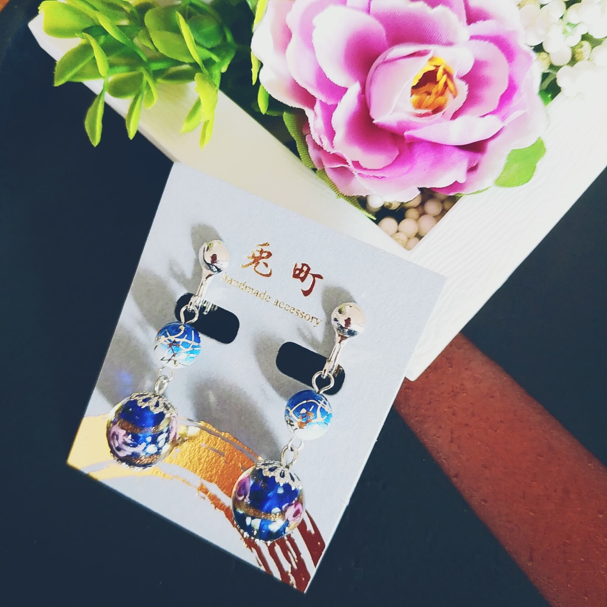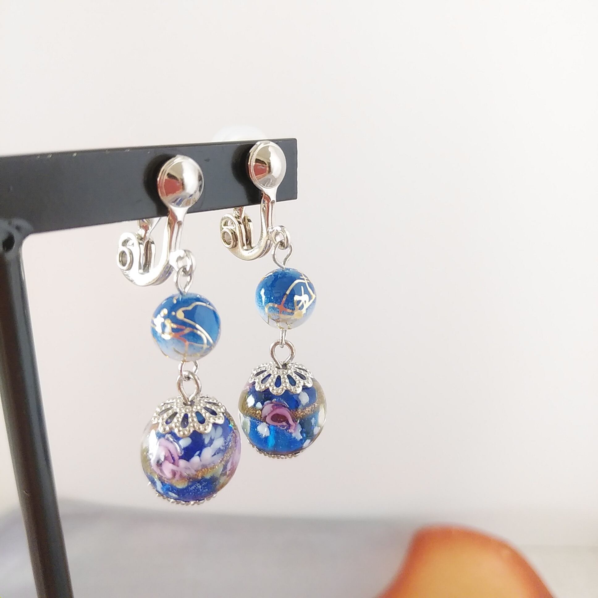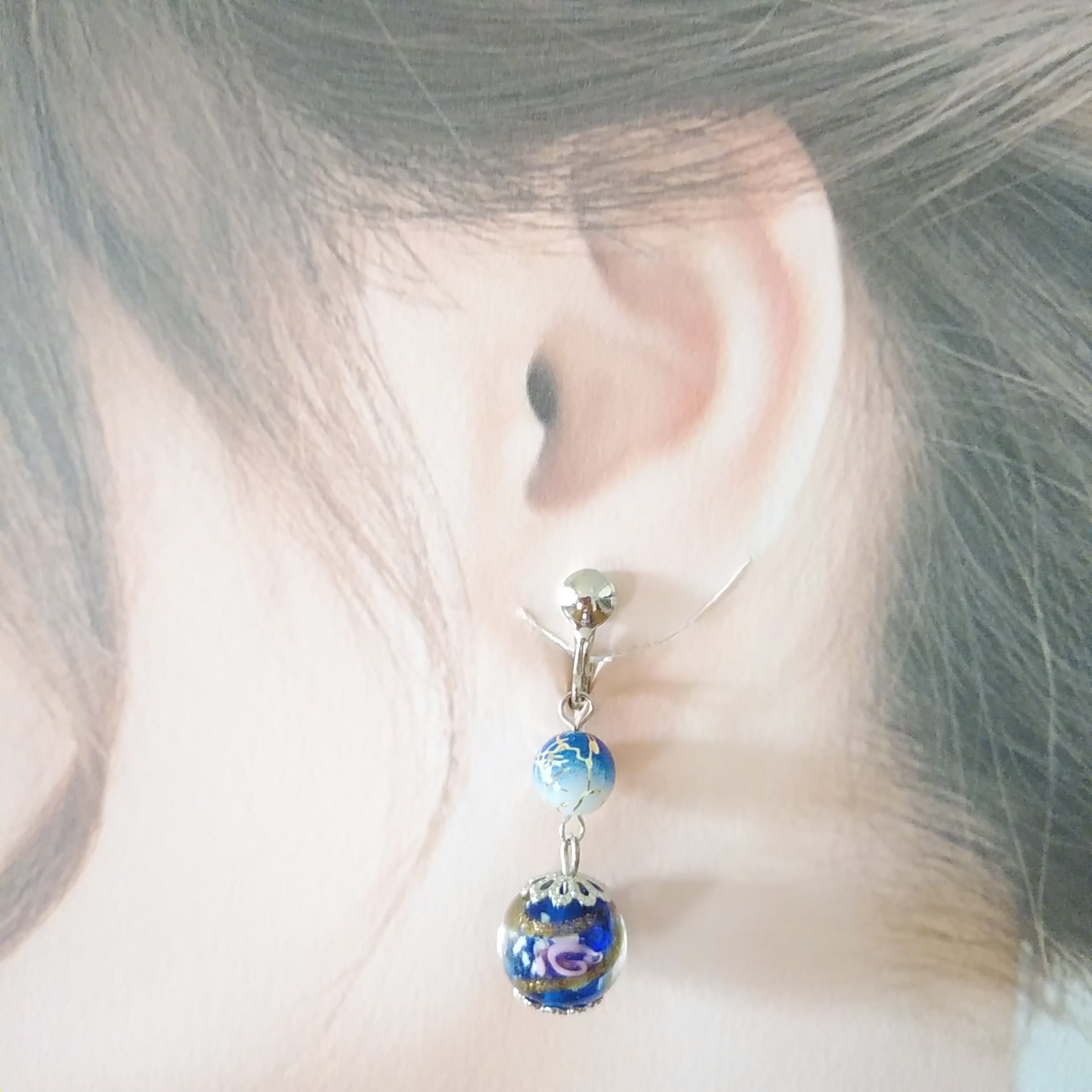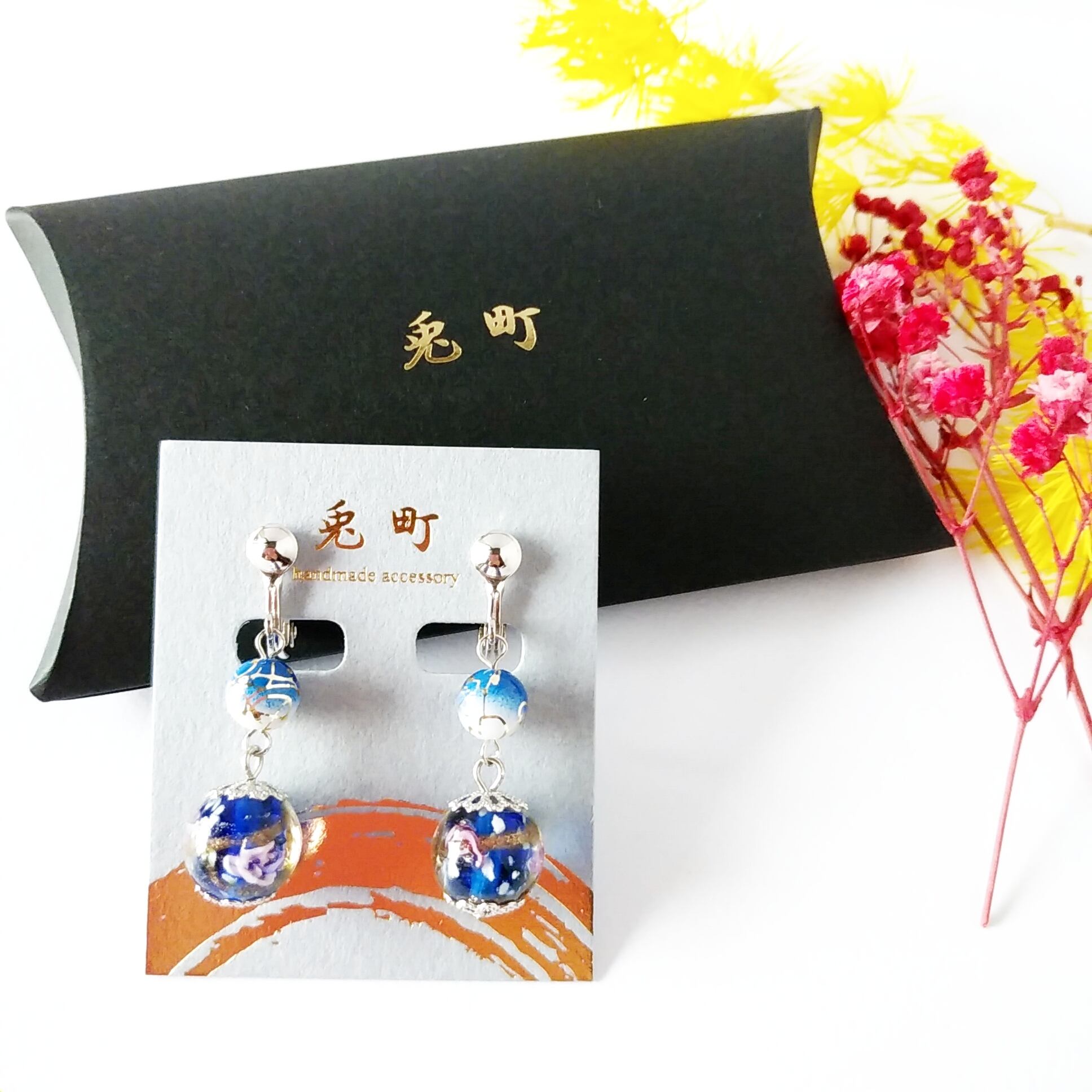 【青白×青トンボ玉】痛くない和柄イヤリング